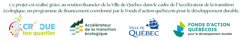 Grâce au soutien financier de la Ville de Québec, coordonné par le Fonds d’action québécois pour le développement durable à travers le programme de l’Accélérateur de la transition écologique, nous développons 6 initiatives environnementales qui seront mises en valeur dans le Quartier-laboratoire tel un musée-vivant.